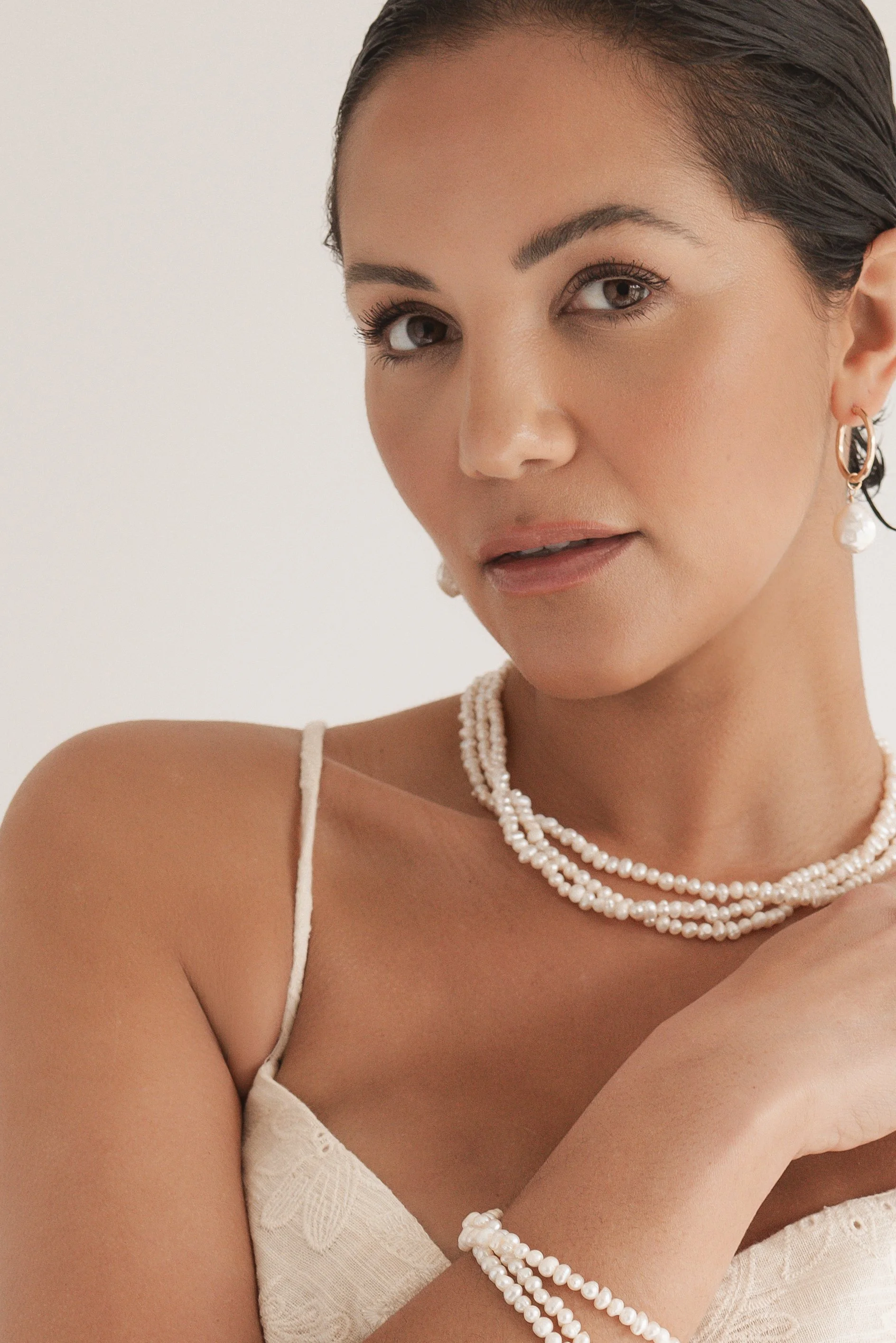 Each piece was chosen to bring interest without overpowering — textured, sculptural pearls paired with understated gold elements to create balance. The result is a look that feels elevated yet effortless and minimal.
