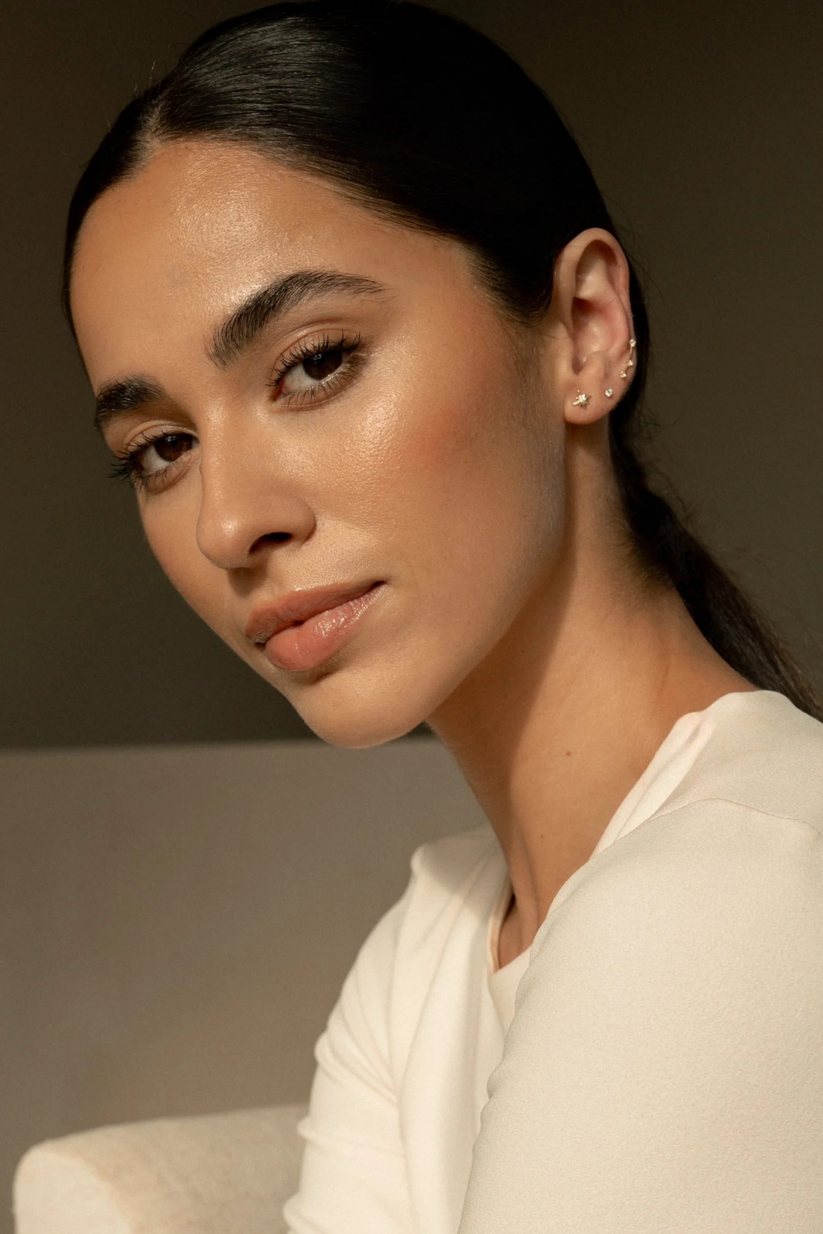 Brighton-based MUA and hair stylist Katie Cullen brought glowy, luminous skin and polished natural hair to the shoot. That quality of makeup in a jewellery editorial is so important — it lifts the gold, softens and gives the whole edit a feeling of effortless warmth. Nothing overdone, nothing that pulled focus.